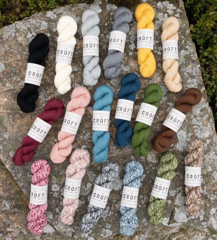 The Croft is available in aran weight and is made from 100% Shetland Islands Wool. The solid colours and tweed shades are named after towns and villages across the islands. .