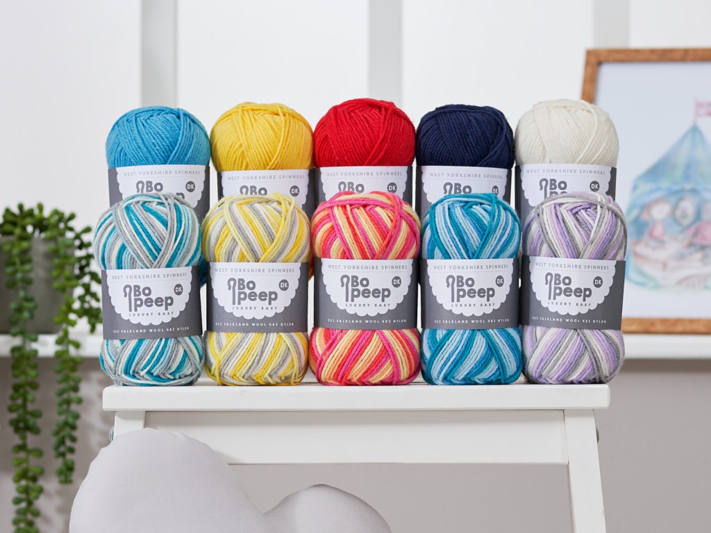 Bo Peep Dk is 52% Falkland Wool and 48%Nylon beautifully soft and machine washable. Available in fun colour palette of solid shades and prints, ideal for baby items and accessories
